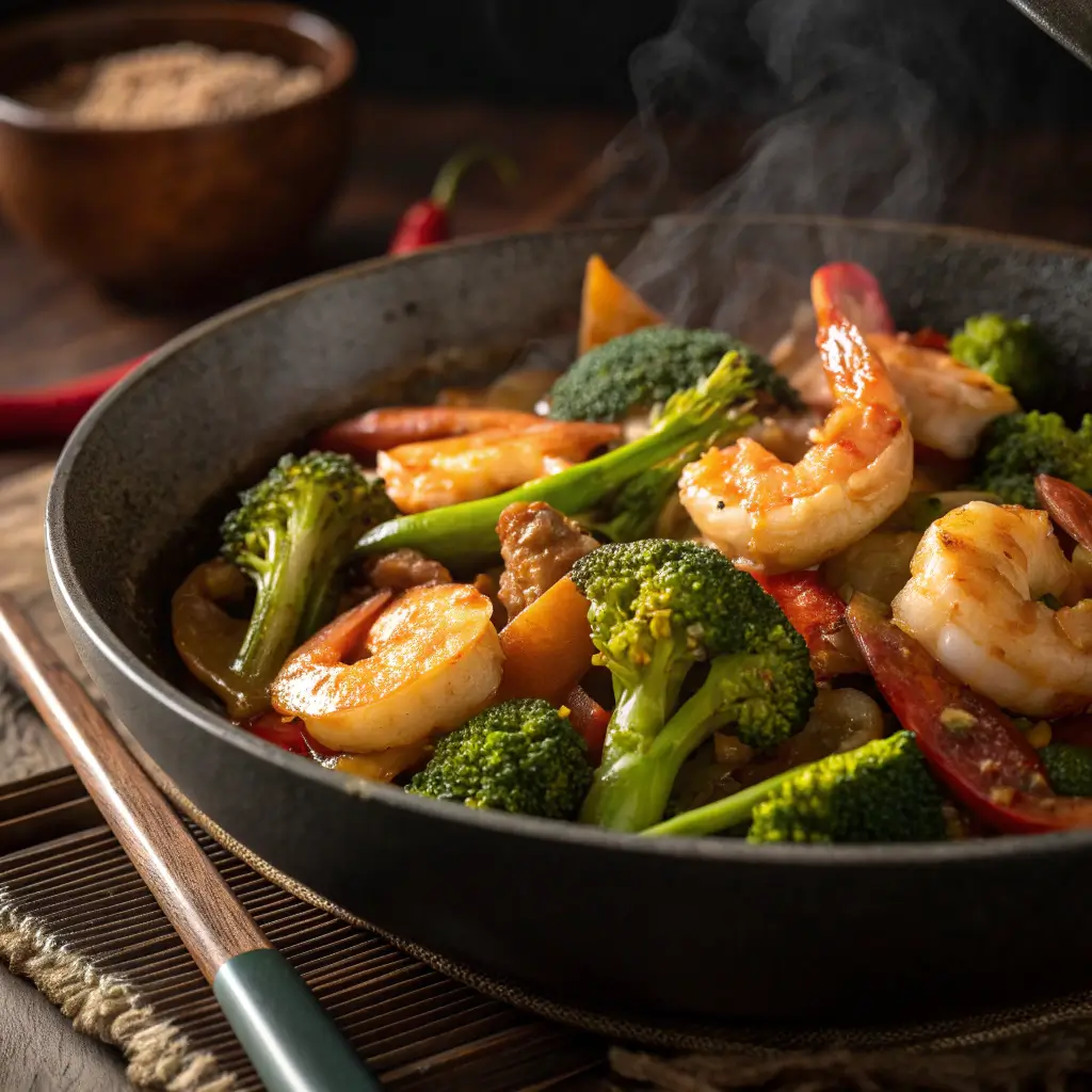 Stir-fry cooking originates from East Asia, particularly China, where high-heat, quick cooking preserves the freshness, color, and nutrients of the ingredients. Shrimp stir-fries are a classic choice due to their short cooking time and ability to absorb bold flavors.