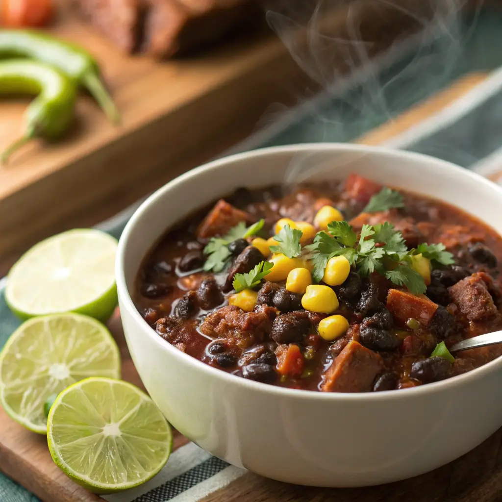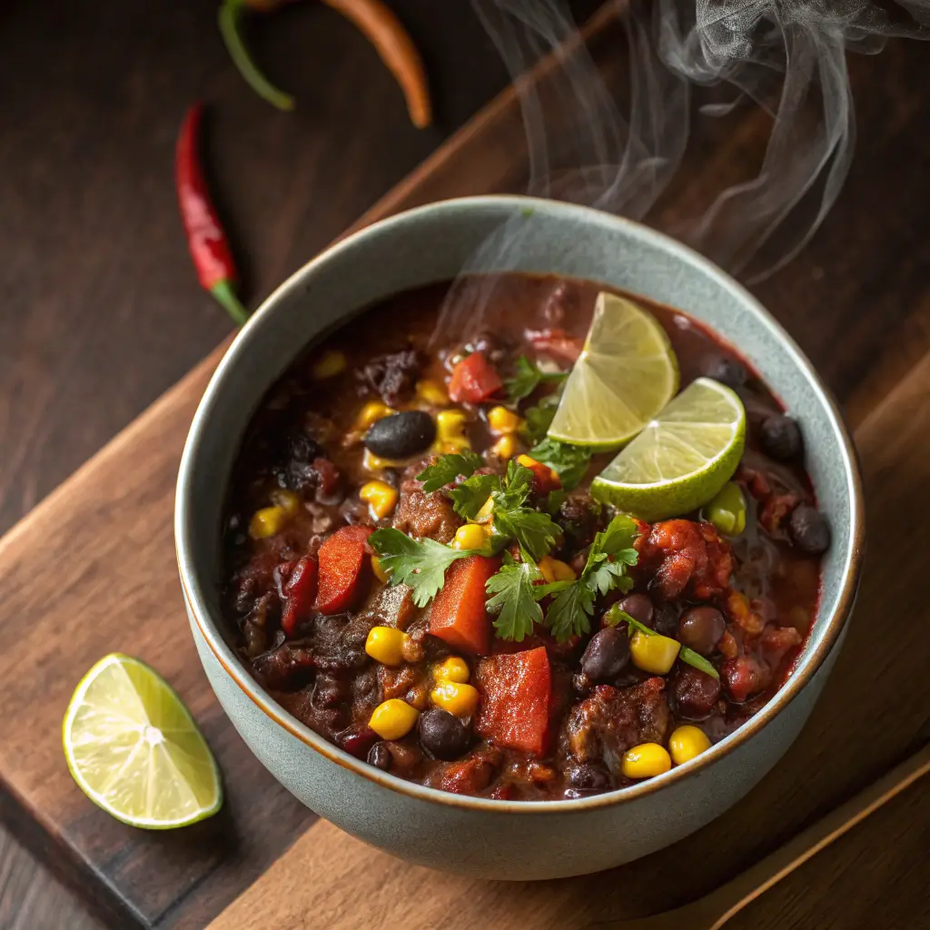 Black Bean & Corn Chili with Chipotle & Lime is a vibrant fusion of smoky spice, sweet corn, and zesty citrus — a bowl full of comfort with a kick. It’s hearty yet refreshing, wholesome yet indulgent, and deeply satisfying whether served on a weeknight or at a weekend gathering.