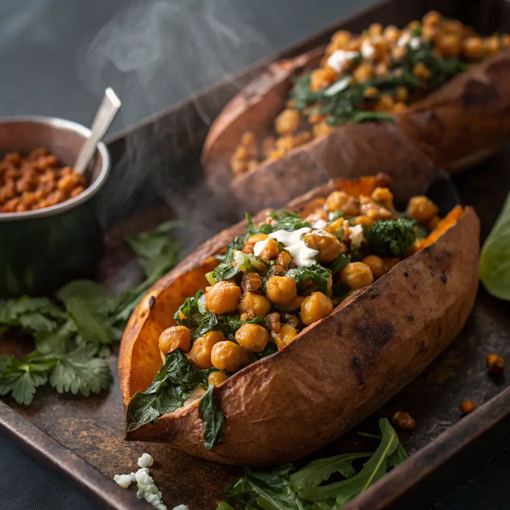 Roasting the sweet potatoes enhances their natural sweetness, while the spiced chickpea-spinach filling adds a savory contrast, creating a balanced flavor profile. Garnishes like tahini or fresh herbs elevate it to a restaurant-quality presentation, while keeping preparation simple.