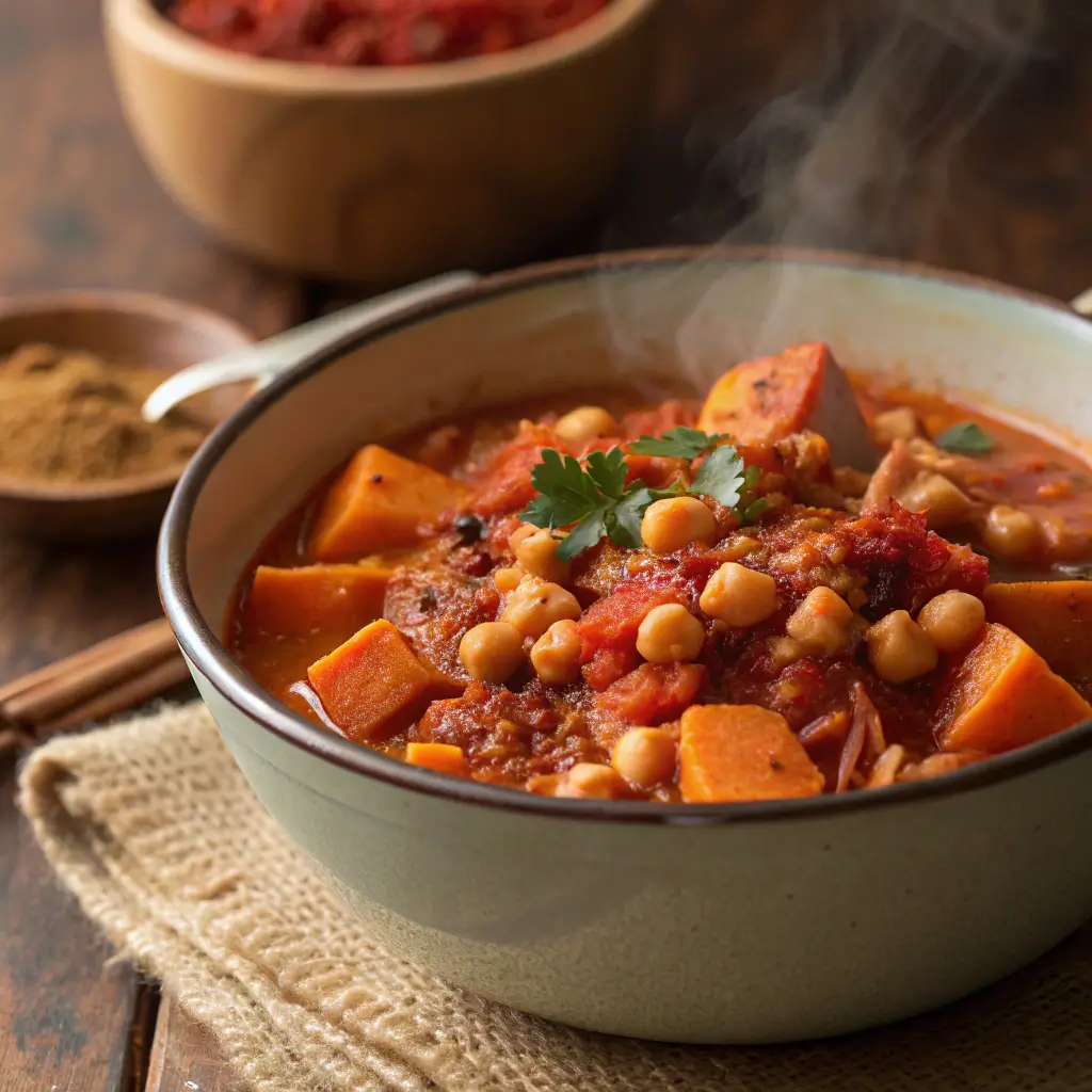 Warm, hearty, and full of bold North African flavor, the Chickpea & Sweet Potato Stew with Harissa is a dish that embodies comfort and nourishment. This vibrant stew combines creamy chickpeas, tender sweet potatoes, and aromatic spices, all tied together with a rich harissa tomato base that delivers just the right amount of heat. It’s a perfect choice for cozy nights, meal prep, or when you need a filling vegetarian option that satisfies like a classic comfort dish.