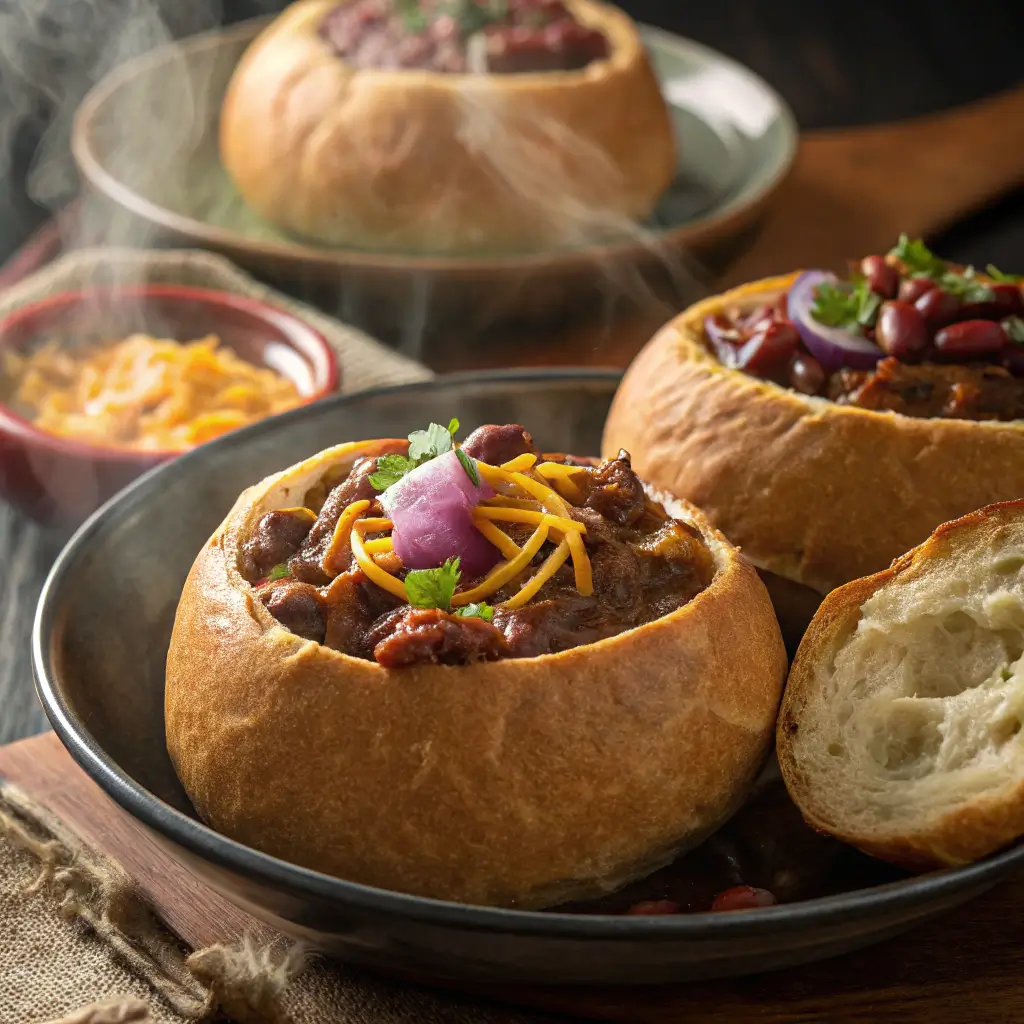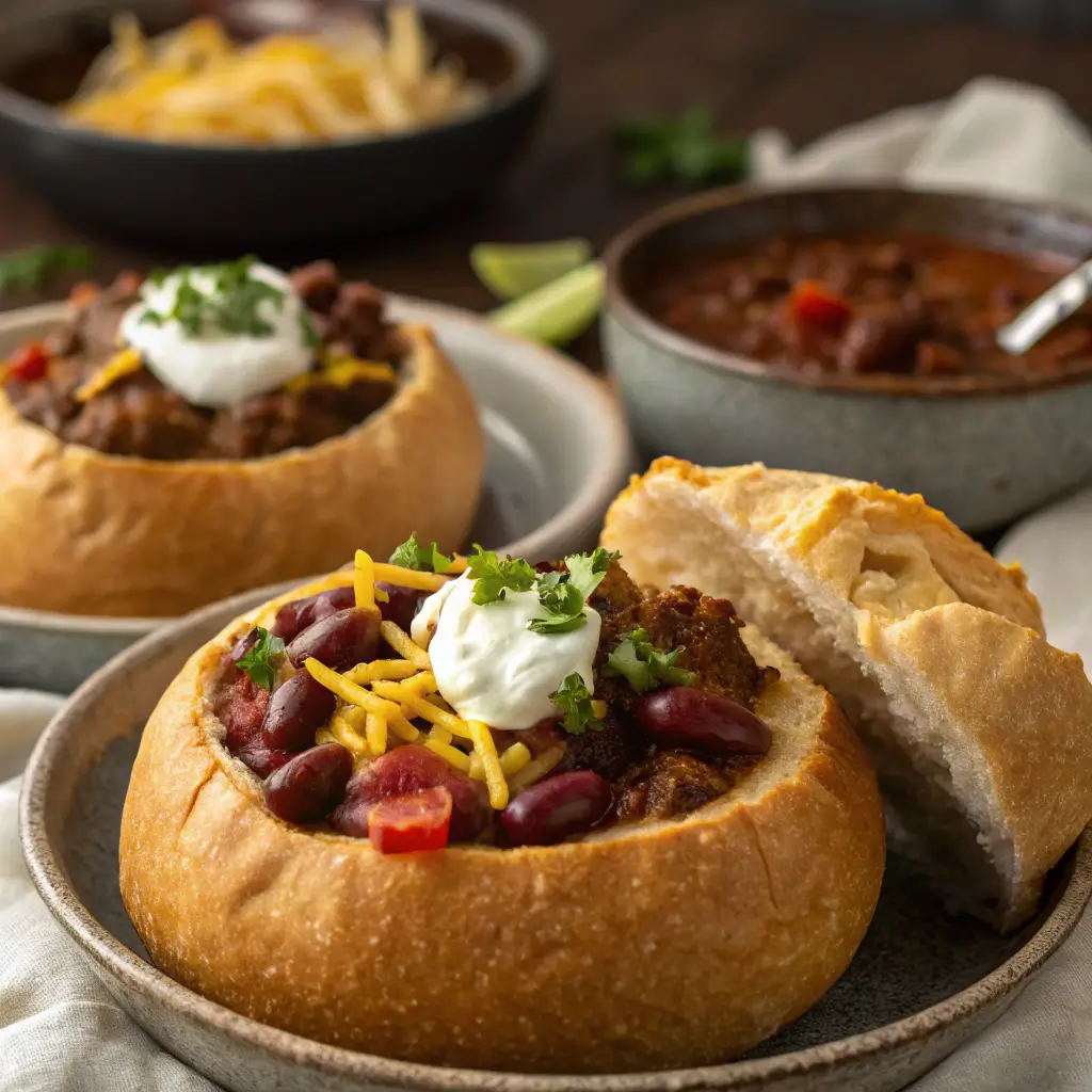 Serve your chili bowls with extra toppings like sour cream, diced avocado, jalapeños, or fresh cilantro. Pair them with a crisp green salad or roasted vegetables for a balanced meal. For gatherings, set up a “chili bar” with assorted toppings so everyone can build their perfect bread bowl.