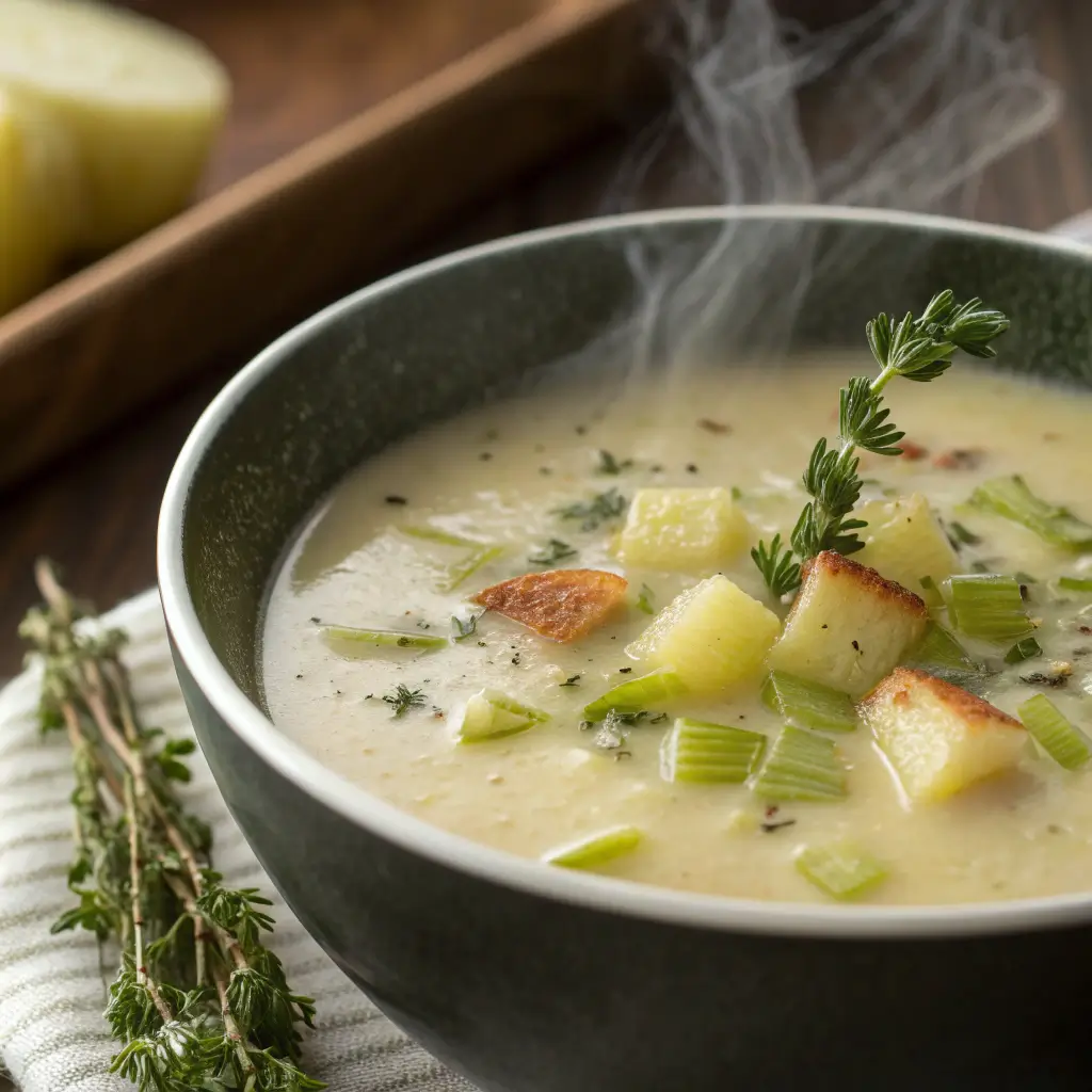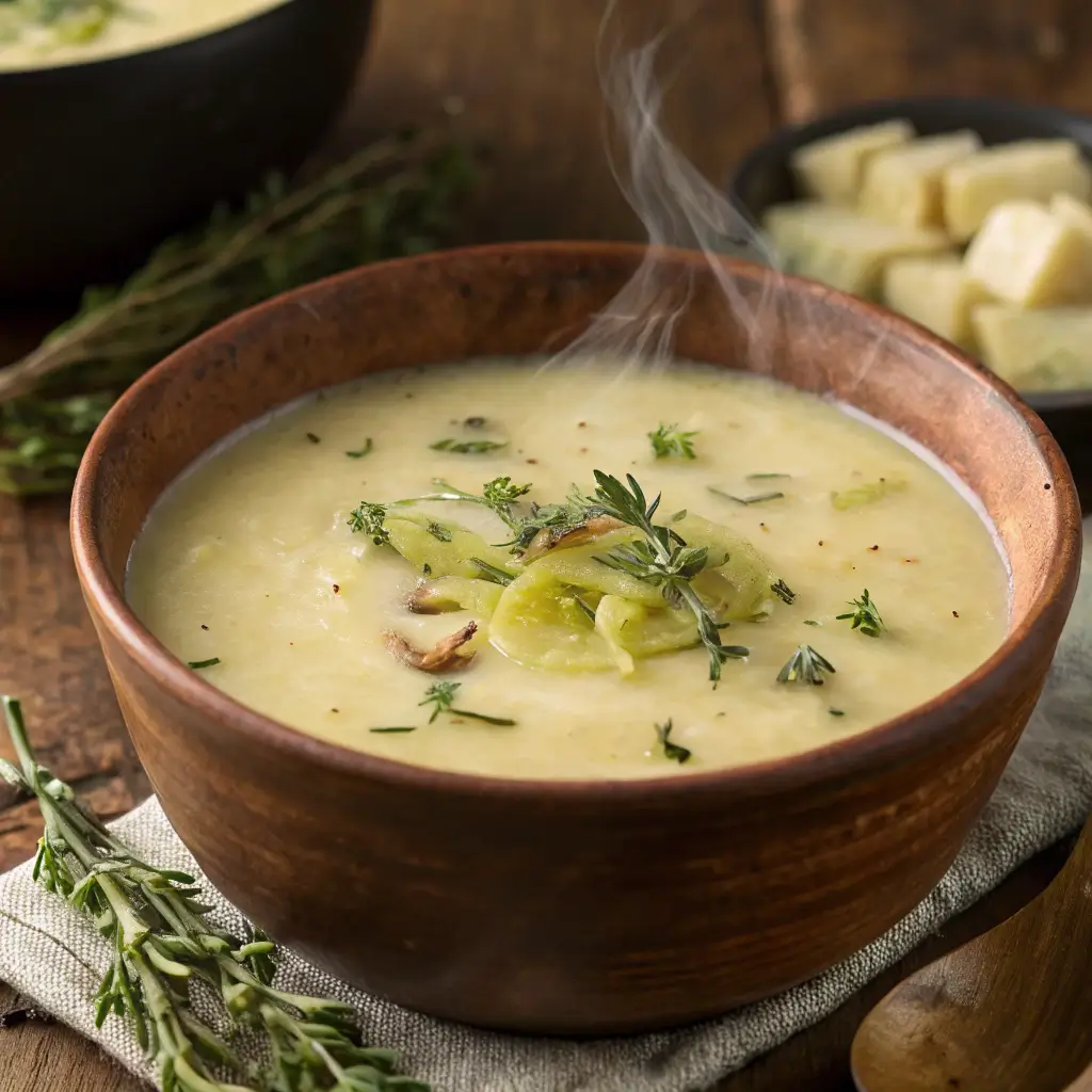 Creamy Potato Leek Soup with Thyme is more than a simple soup—it’s a comforting embrace in a bowl. Silky, aromatic, and delicately flavored, it delivers warmth and satisfaction with every spoonful. The combination of tender leeks, soft potatoes, and fragrant thyme creates a harmony that’s both rustic and refined.