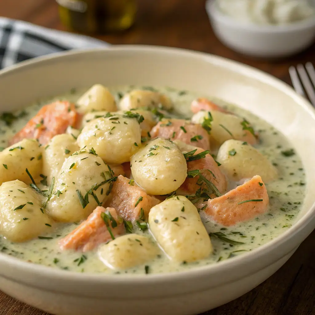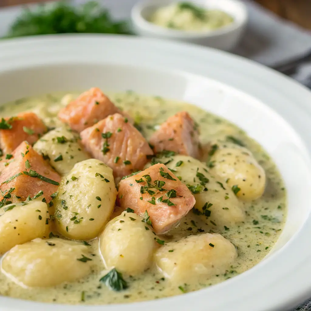 Visual Cue: The gnocchi should be coated in creamy sauce, with salmon pieces tender and flaky, and garnished with fresh herbs for a vibrant presentation.