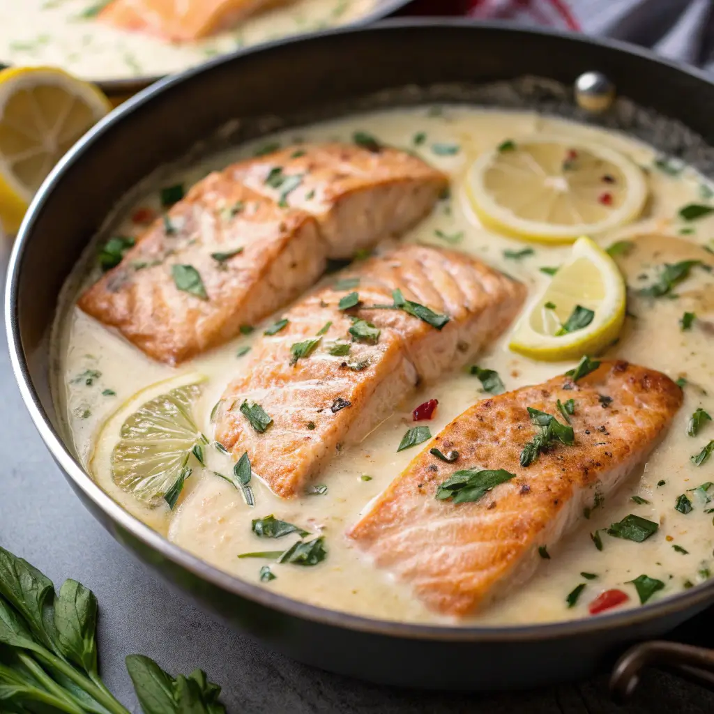 Nestle the seared salmon fillets back into the creamy sauce. Spoon sauce over the fish and let everything simmer together for 2–3 minutes so the flavors meld beautifully.