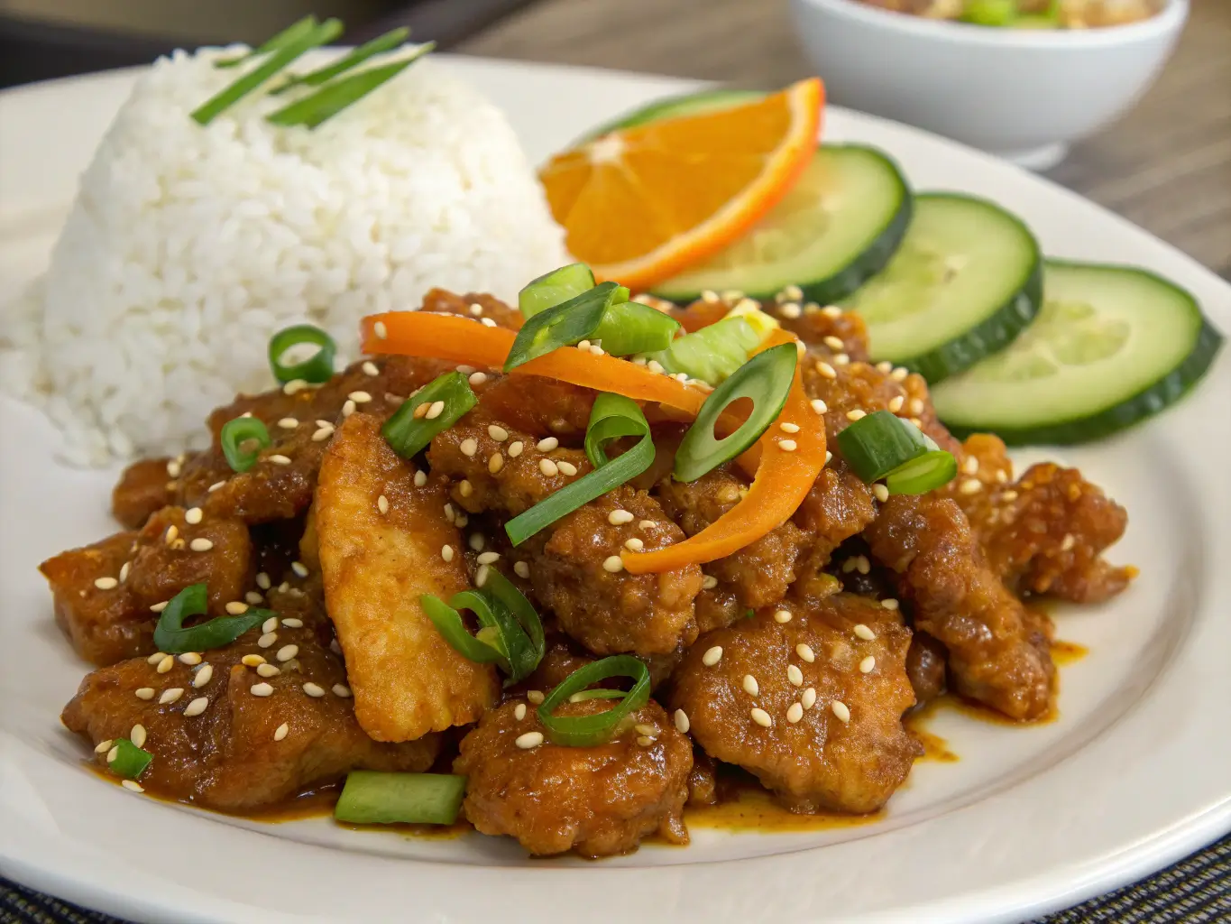 - Plate Immediately: Over rice, garnished with green onions, sesame seeds, and orange slices.