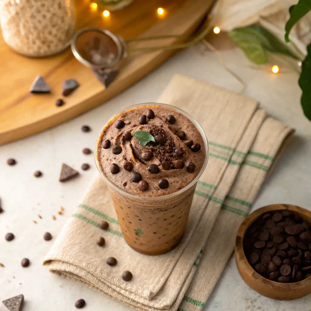 The result is a creamy, icy chocolate drink with tiny chocolate bits in every sip — like a frozen chocolate milkshake with extra texture.