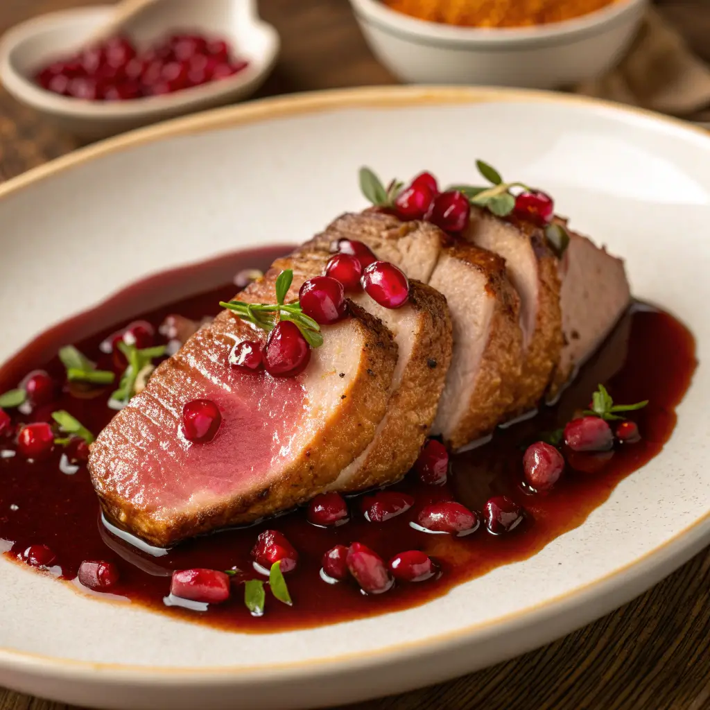 Slice the rested duck breasts diagonally into thin medallions. Arrange on a warm plate, drizzle generously with the pomegranate glaze, and garnish with fresh pomegranate seeds and herbs for a burst of color.