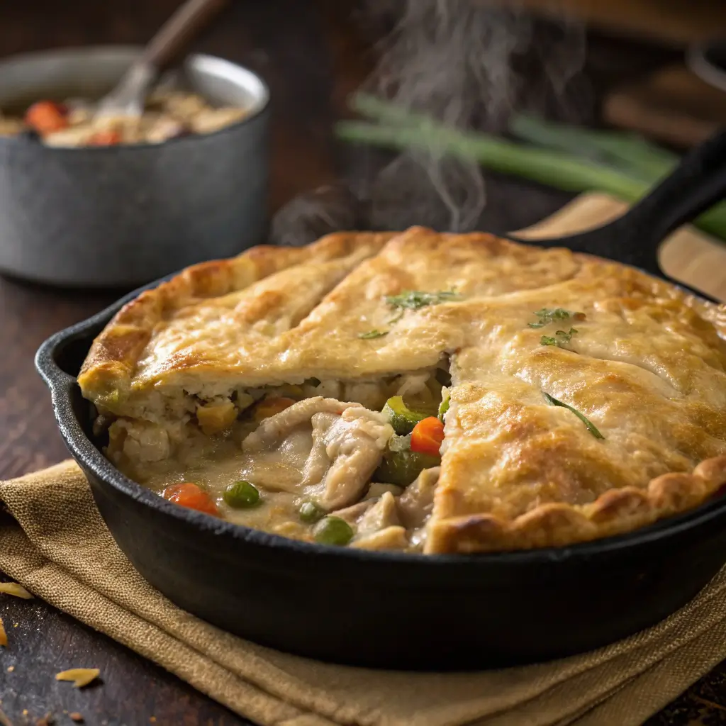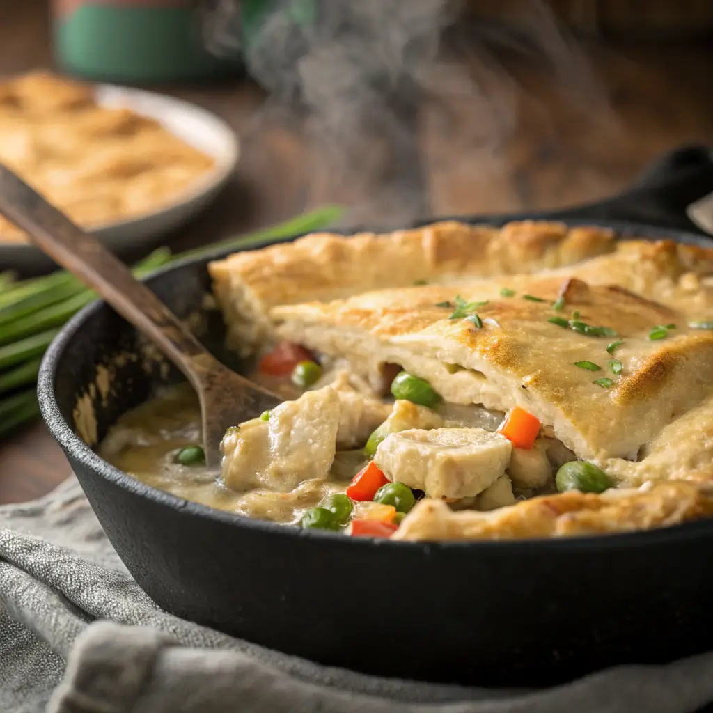 The beauty of this recipe lies in its convenience: everything is cooked in a single skillet, from sautéing the vegetables to simmering the chicken filling and finally browning the crust. You get all the traditional flavors of a pot pie, but with minimal cleanup and maximum flavor. This dish is highly customizable—you can swap vegetables according to what’s in season or what you have on hand, and the creamy sauce can be easily adjusted to your taste.
