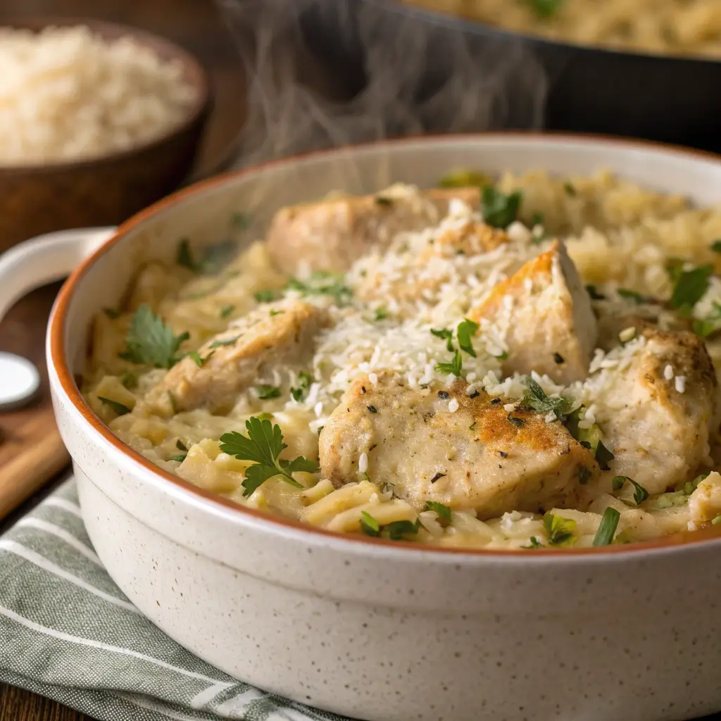 What makes this recipe special is its simplicity and versatility. Everything cooks together in one dish, allowing the flavors to meld naturally. The result is a warm, satisfying meal with minimal effort and cleanup. Its creamy texture, juicy chicken, and tender rice make it a crowd-pleasing, nourishing dinner that appeals to all ages.