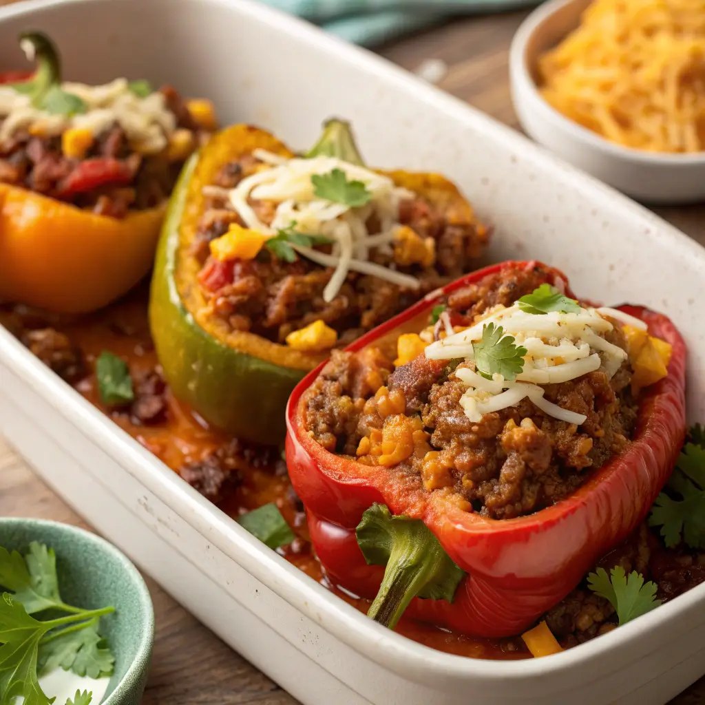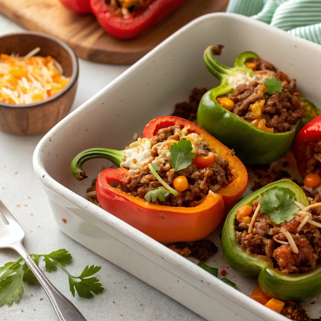 Stuffed peppers have roots in Mediterranean and American cuisine, where bell peppers are hollowed and filled with a mixture of meat, grains, and vegetables. The taco twist incorporates classic Mexican-inspired flavors like cumin, paprika, and chili powder, bringing a bold and familiar taste to a traditional dish.