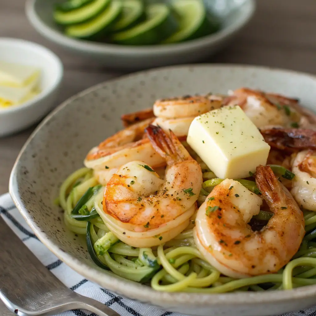 Zucchini noodles have surged in popularity as a low-carb, gluten-free pasta substitute. Paired with shrimp, a lean and quick-cooking protein, they create a balanced, nutritious meal. Garlic butter is a classic pairing for seafood, originating from Mediterranean cooking traditions, where simple ingredients like butter, garlic, and fresh herbs enhance the natural flavors of the fish or shellfish.