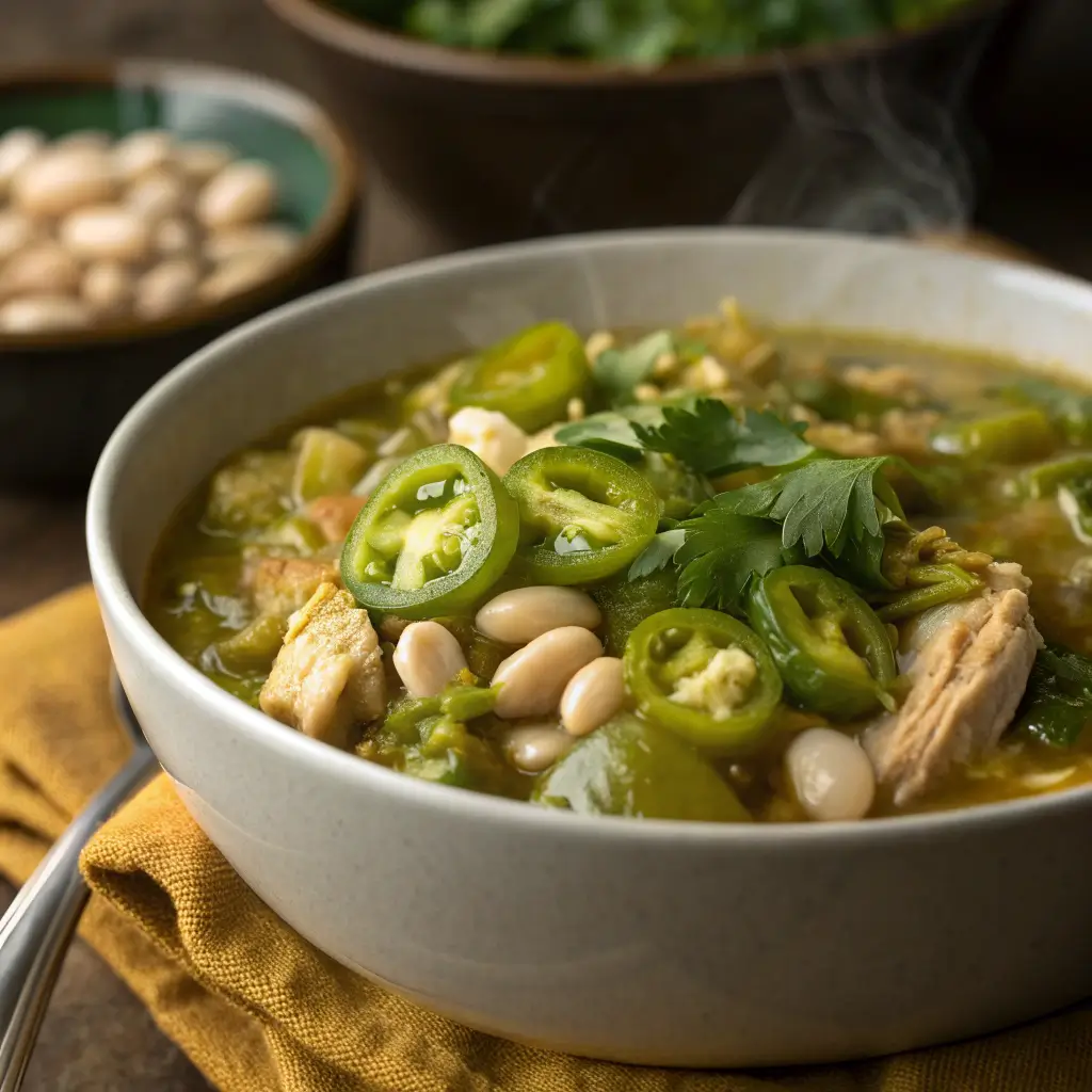 Tomatillos — small green husked fruits related to tomatoes — are the heart of this dish. When roasted, they develop a tangy-sweet depth that forms the base of the chili’s vibrant green sauce. Combined with the gentle warmth of jalapeños and the creaminess of beans, this chili delivers all the comfort of a classic bowl with a fresh, lively twist.