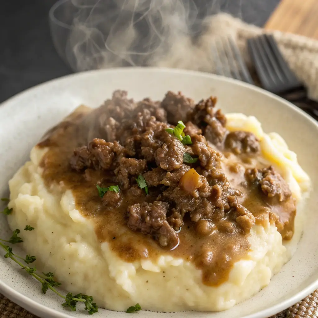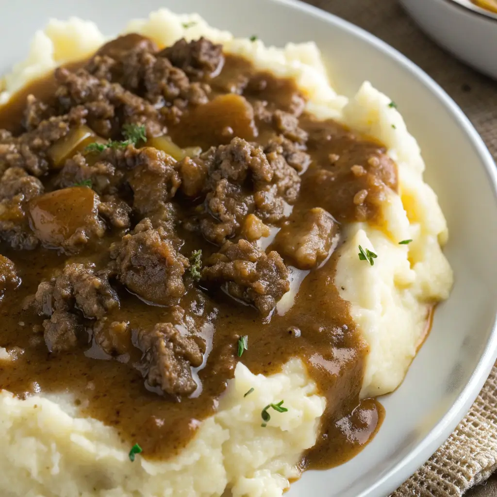 Few meals are as soul-satisfying as a hearty plate of ground beef and gravy served over fluffy mashed potatoes. This dish is the definition of comfort food—simple ingredients transformed into something rich, warm, and deeply flavorful. Whether you’re feeding a hungry family on a weeknight or craving something nostalgic and filling, this recipe delivers all the coziness of home cooking in under 45 minutes.