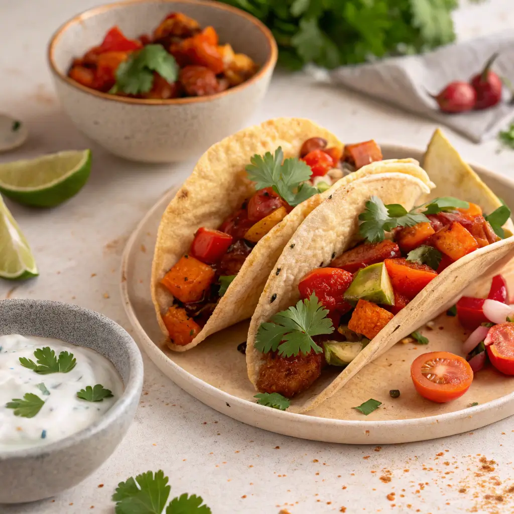 Harissa, a North African chili paste, brings smoky, earthy heat that pairs beautifully with roasted vegetables. Topped with a cooling garlic yogurt sauce, these tacos are balanced in flavor and texture. Unlike typical vegetarian tacos, the harissa adds a gourmet, spicy punch without overwhelming the palate.