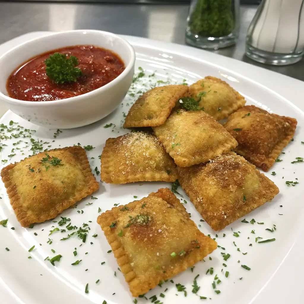 Fried ravioli tastes best when served hot. Pair with marinara sauce, a sprinkle of Parmesan, and fresh herbs like basil or parsley.