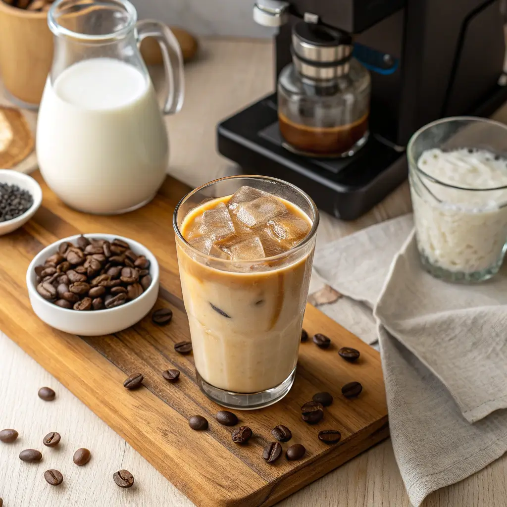 If you don’t have an espresso machine, strong brewed coffee works perfectly. Just brew it a bit stronger than usual so it doesn’t taste diluted when poured over ice. Whole milk gives the creamiest result, while oat milk adds natural sweetness. Almond milk creates a lighter drink, and low-fat milk keeps it less rich.