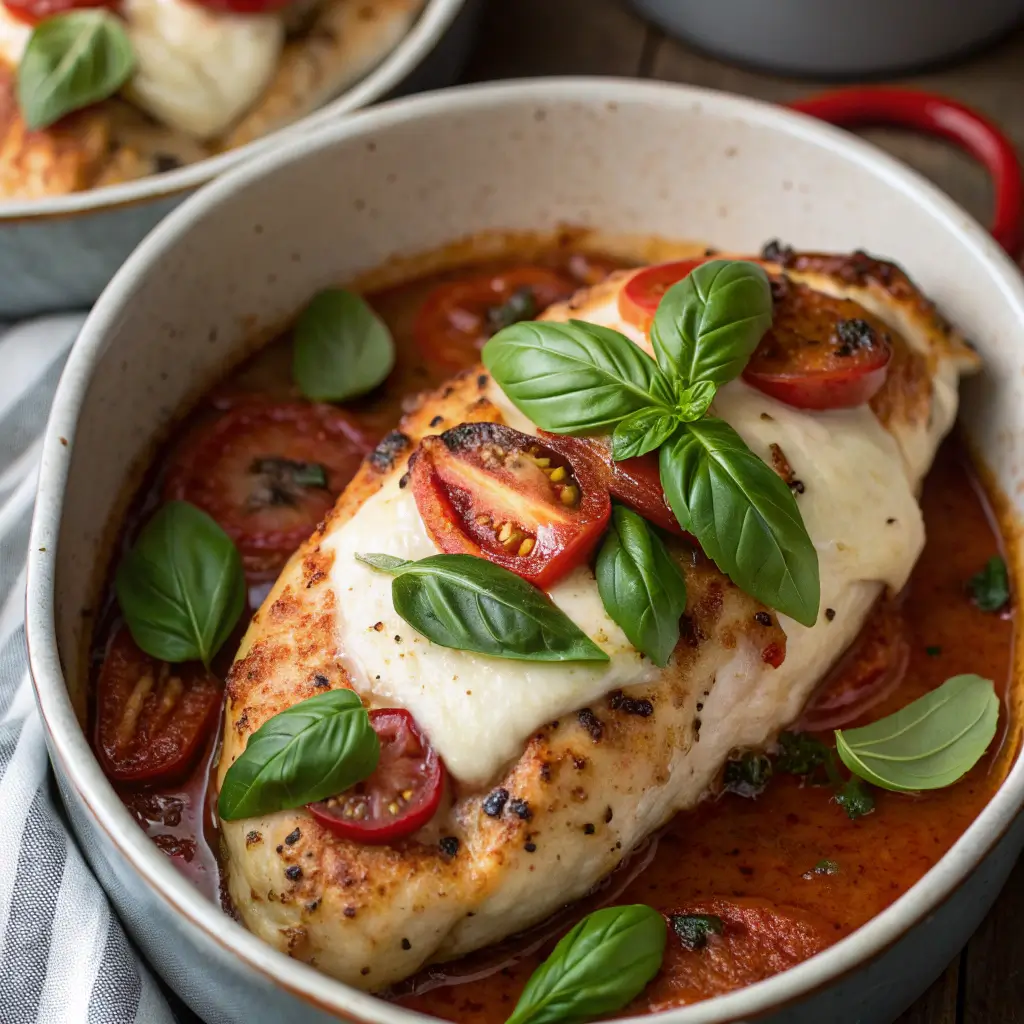 Visual Cue: Chicken should be golden, with melted cheese visible at the edges, and vibrant tomato and basil peeking through.