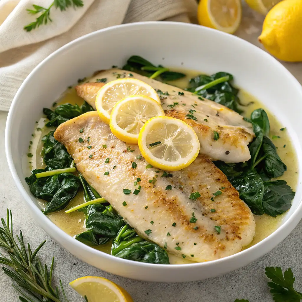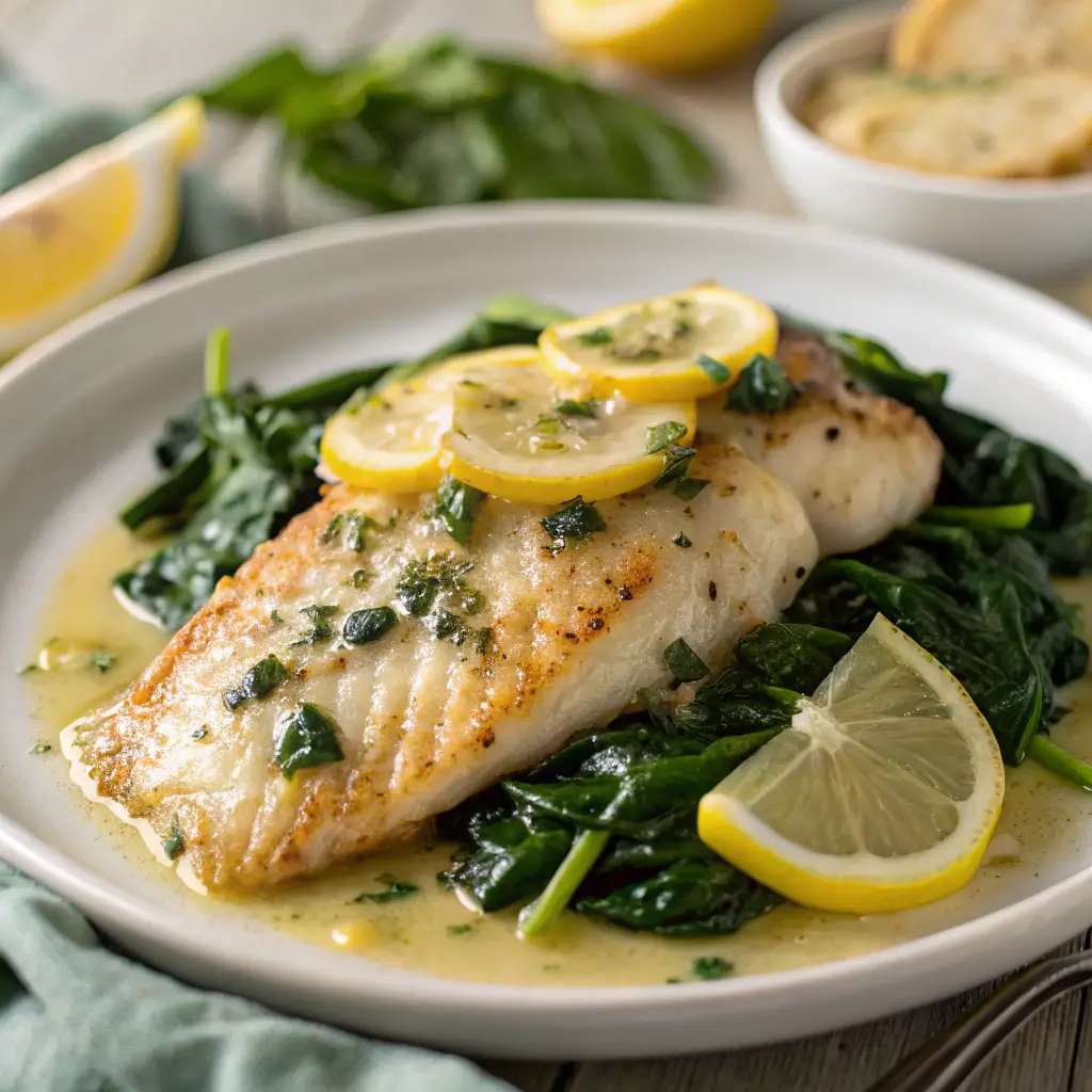 Adding spinach to the skillet not only provides a nutritional boost but also contributes to the color and texture of the dish. This combination of flaky fish, buttery sauce, and tender greens creates a balanced, elegant meal in minutes—a modern, healthy twist on traditional seafood preparations.