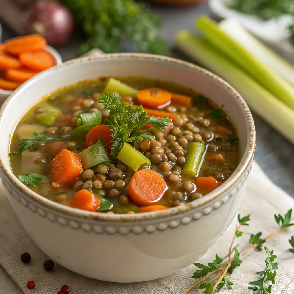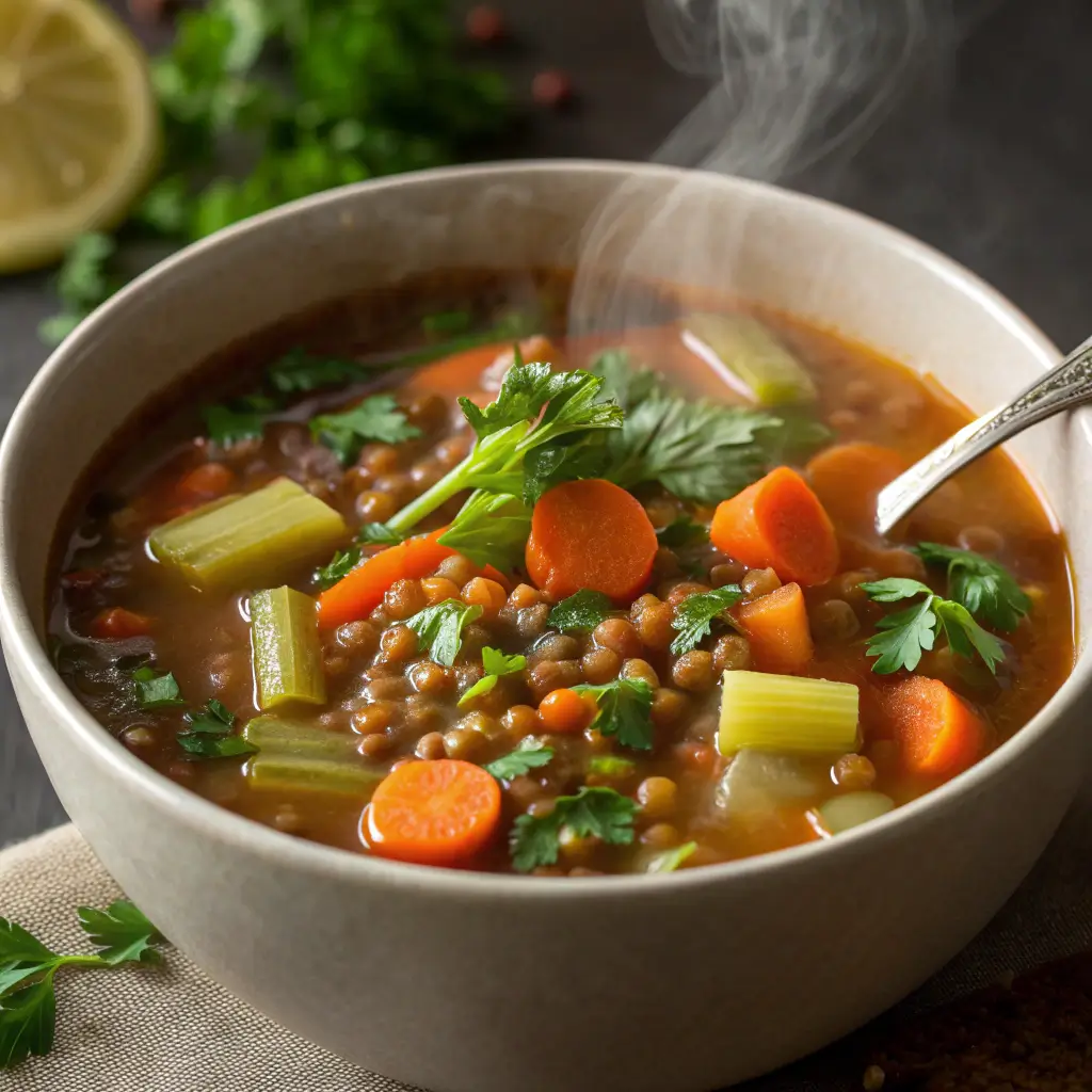 A steaming bowl of Lentil Soup with Carrots, Celery & Herbs is the definition of hearty comfort food. Packed with protein-rich lentils, aromatic herbs, and nourishing vegetables, this dish is both simple and deeply satisfying. Whether served as a wholesome weeknight dinner, a meal-prep favorite, or a cozy weekend lunch, it delivers comfort and nutrition in every spoonful.