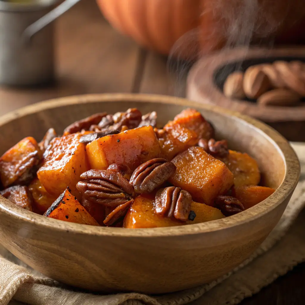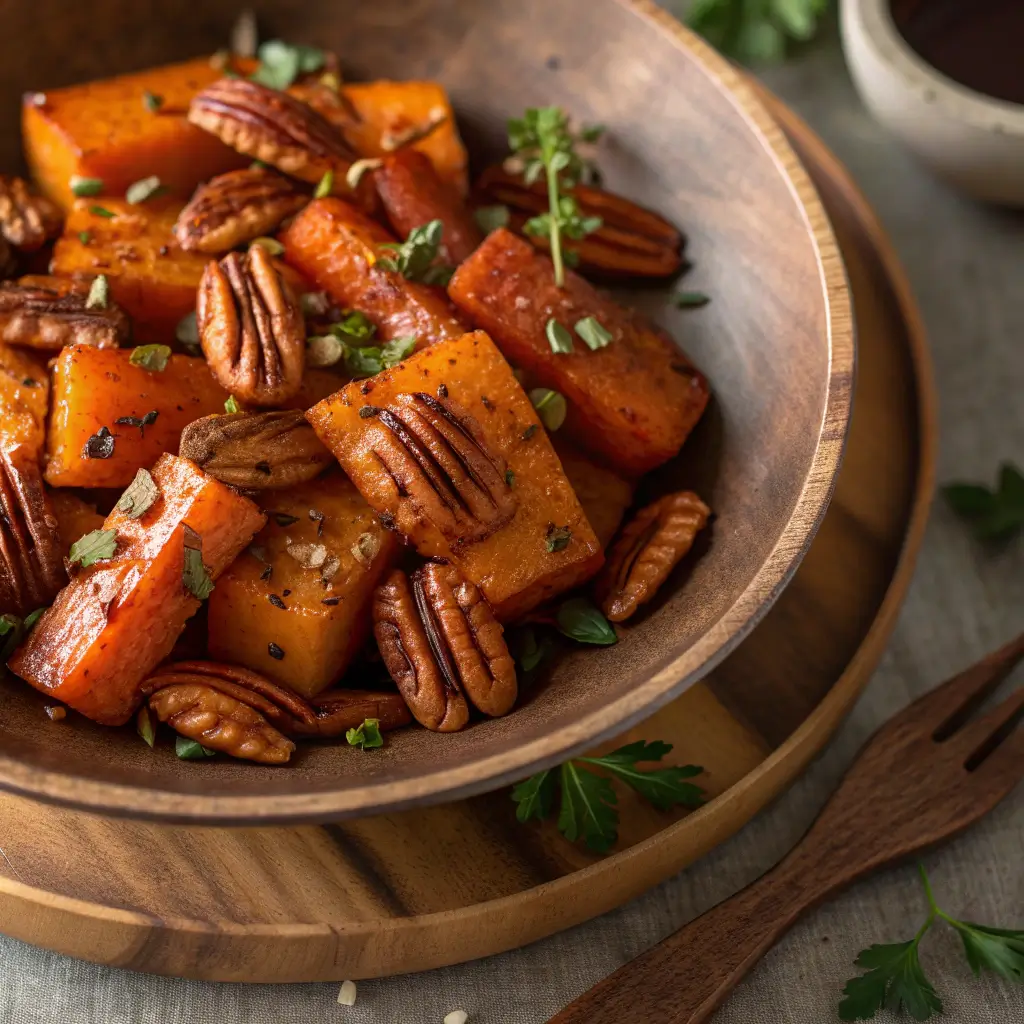 The technique of roasting brings out their natural sugars, intensifying flavor and creating a caramelized exterior. Maple syrup, a classic North American ingredient, complements these earthy vegetables perfectly, while toasted pecans add a buttery crunch that ties the dish together. The result is a side dish that feels timeless, wholesome, and wonderfully satisfying.