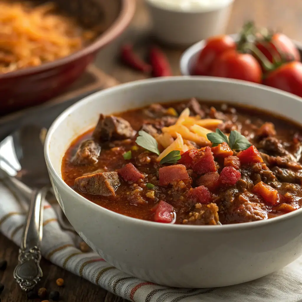 This recipe focuses on simplicity, quality ingredients, and time-honored technique. The beef becomes melt-in-your-mouth tender, soaking up layers of chili powder, cumin, paprika, and chipotle spice. Each spoonful delivers warmth, richness, and that unmistakable depth that only slow-cooked meat can bring. Perfect for game day, family dinners, or a cold evening when only a hearty bowl will do, this no-bean chili is all about robust, unapologetic flavor.