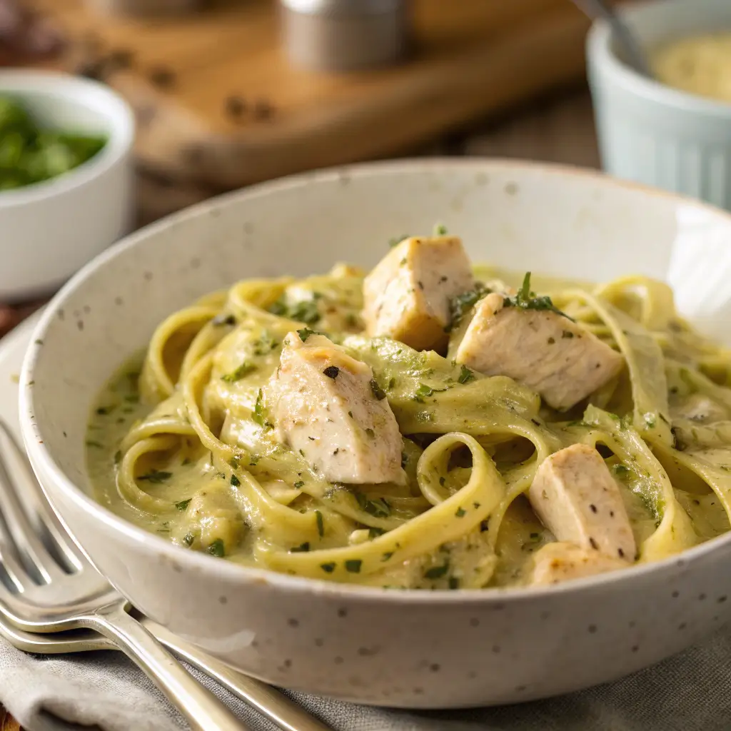 Creamy & Flavorful: Rich pesto sauce with tender chicken and perfectly cooked pasta.