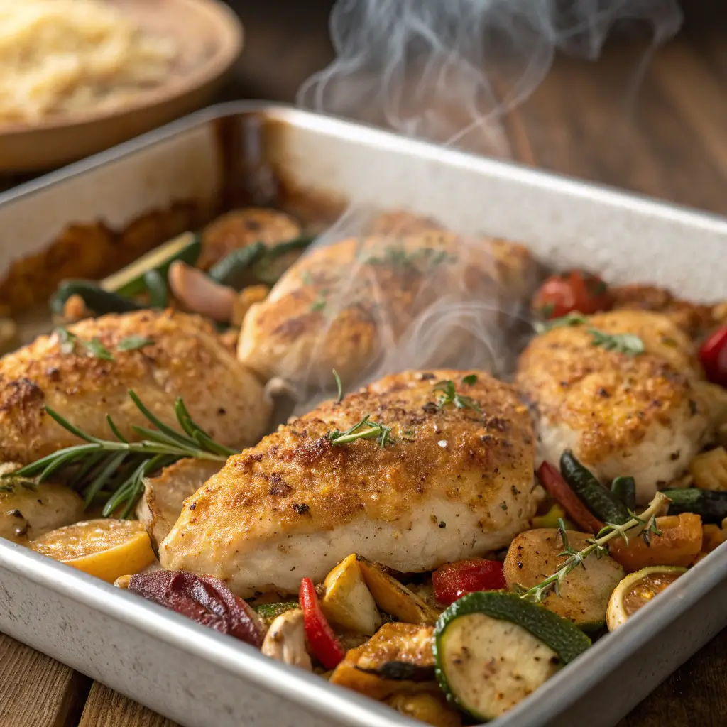 Bake for 20–25 minutes, or until chicken reaches an internal temperature of 165°F (74°C) and the vegetables are tender and lightly caramelized.