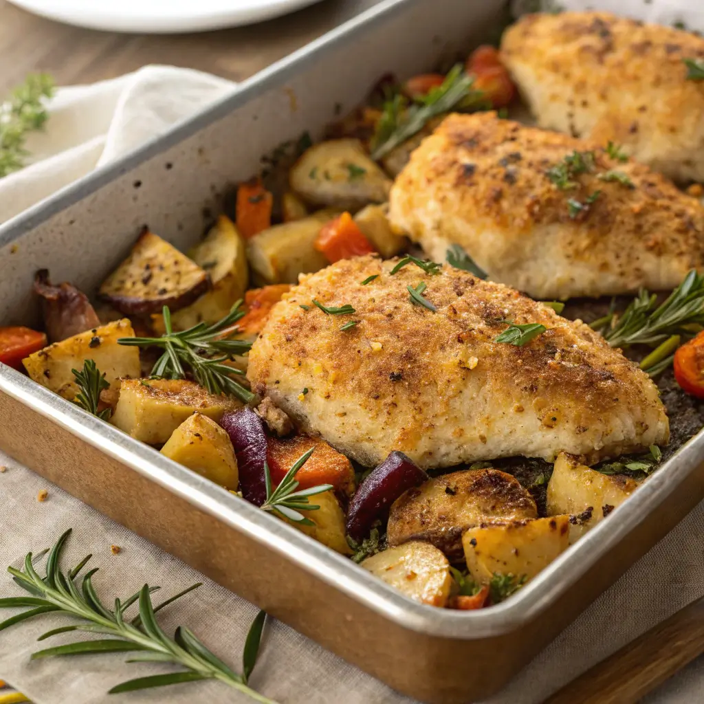 The Parmesan crust provides a golden, crunchy exterior while keeping the chicken moist on the inside. Roasting the vegetables at the same time allows them to caramelize naturally, enhancing their sweetness and complementing the savory chicken. With minimal cleanup and maximum flavor, this sheet pan dinner is ideal for families, entertaining, or meal prep for the week.