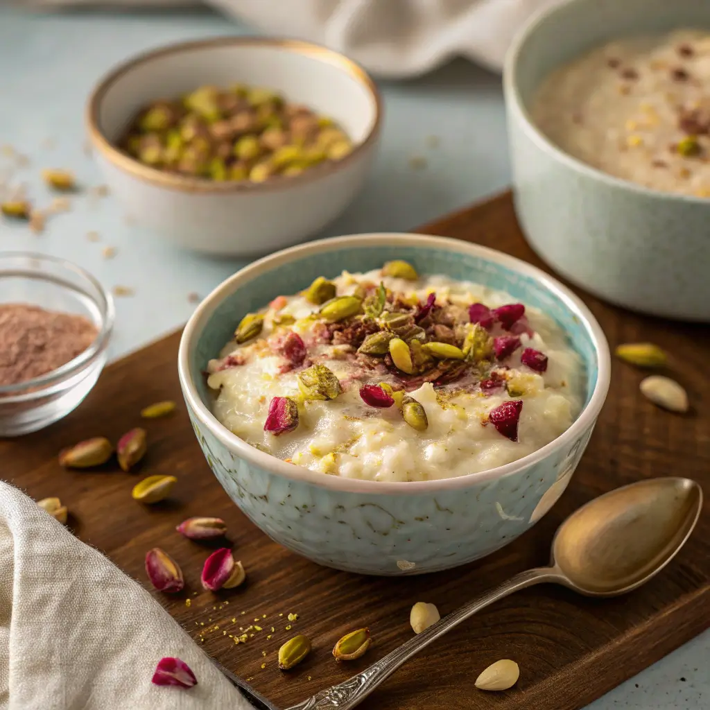 This dessert is easy to prepare yet impressively elegant, making it ideal for both casual family dinners and special occasions. The rose water adds a fragrant Middle Eastern flair, while the pistachios provide a satisfying crunch and a burst of flavor. Whether served warm straight from the stove or chilled for a refreshing finish, this rice pudding is versatile, visually stunning, and irresistibly delicious.