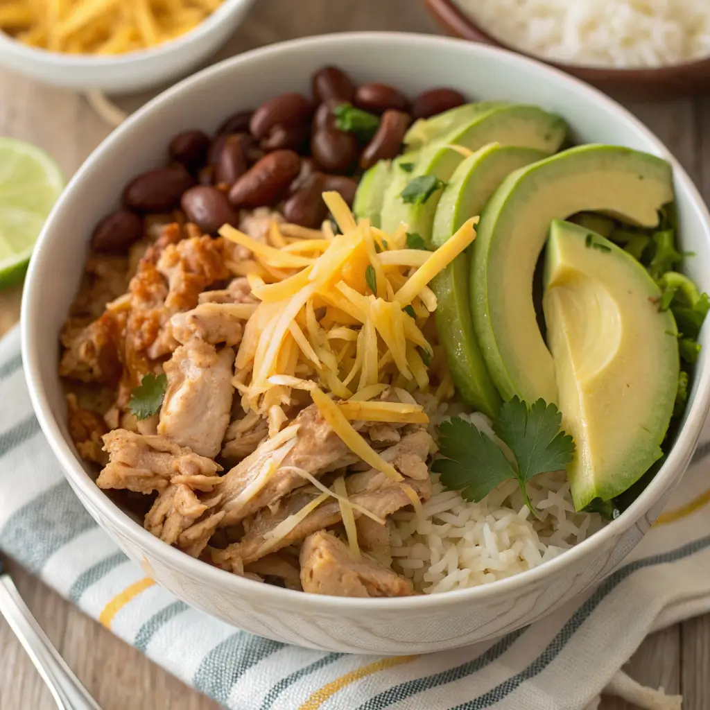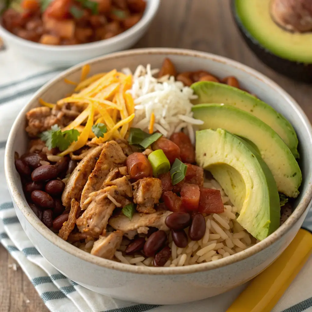 Scoop chicken, rice, beans, and vegetables into bowls. Top with optional ingredients such as avocado slices, shredded cheese, fresh cilantro, lime juice, and sour cream. Serve warm and enjoy a colorful, flavorful meal.