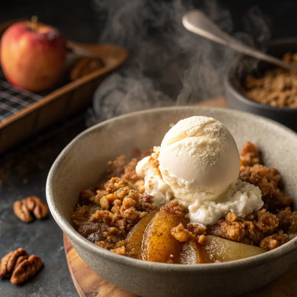 The addition of walnuts adds richness and texture, while warm spices like cinnamon, nutmeg, and a hint of ginger create an aromatic experience reminiscent of autumn and winter festivities. Pairing the crisp with vanilla ice cream is a classic approach, enhancing both temperature contrast and creaminess, making each bite indulgent yet balanced.