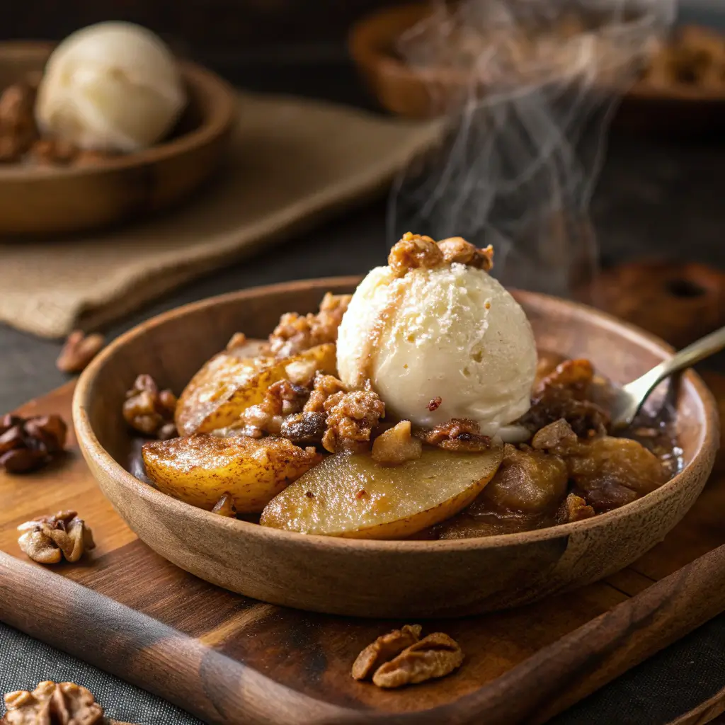 This Spiced Pear & Walnut Crisp with Vanilla Ice Cream is a warm, comforting, and indulgent dessert that’s perfect for any occasion. The combination of tender, sweet pears, crunchy walnut topping, and creamy ice cream creates a dessert that’s rich in flavor, texture, and visual appeal.