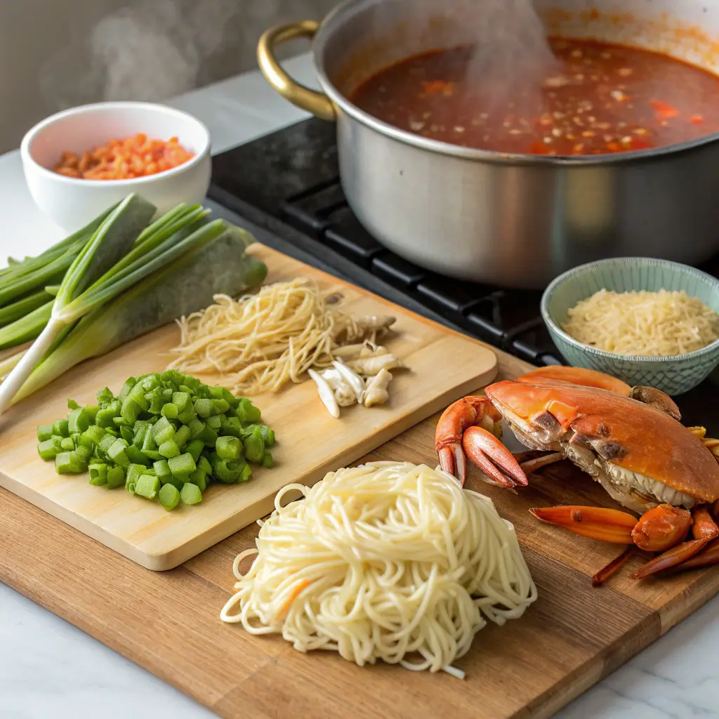 - Combine Ingredients: In a large pot, combine the chicken or seafood broth, crab stock, soy sauce, fish sauce, sriracha, miso paste, sesame oil, grated ginger, minced garlic, and chili flakes (if using). Stir well to combine.