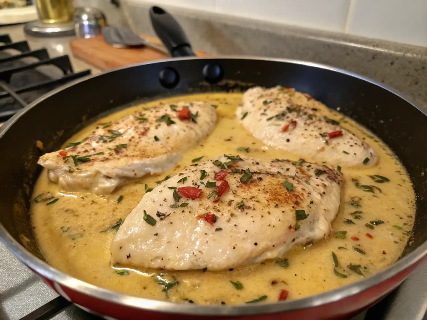 - Reduce heat to medium-low, cover, and simmer 10–12 minutes until chicken reaches 165°F (74°C).
