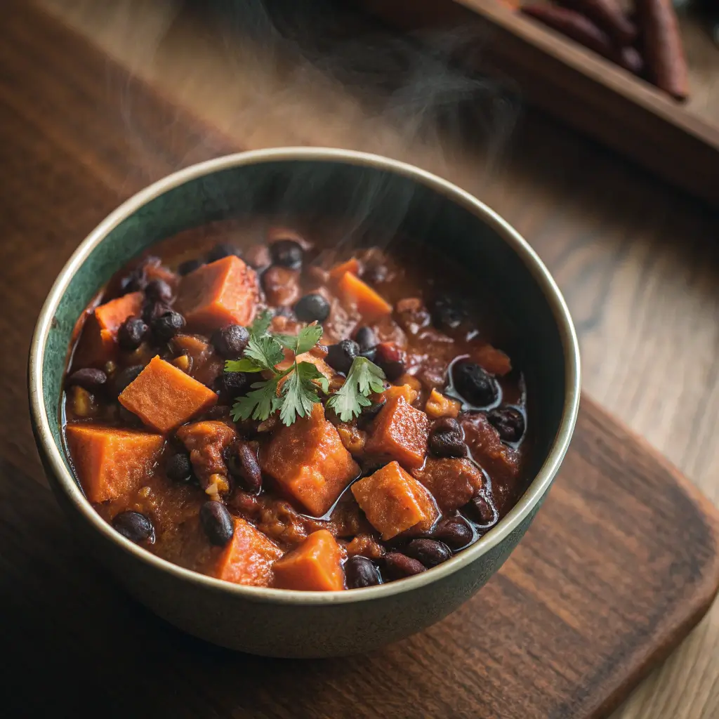 Chili has deep roots in American and Mexican-inspired cuisine, traditionally built around slow-simmered beans, spices, and hearty ingredients. This modern plant-based twist celebrates those same bold flavors but with a nutrient-packed, earthy sweetness from sweet potatoes and the protein-rich punch of black beans.