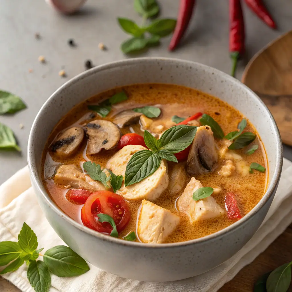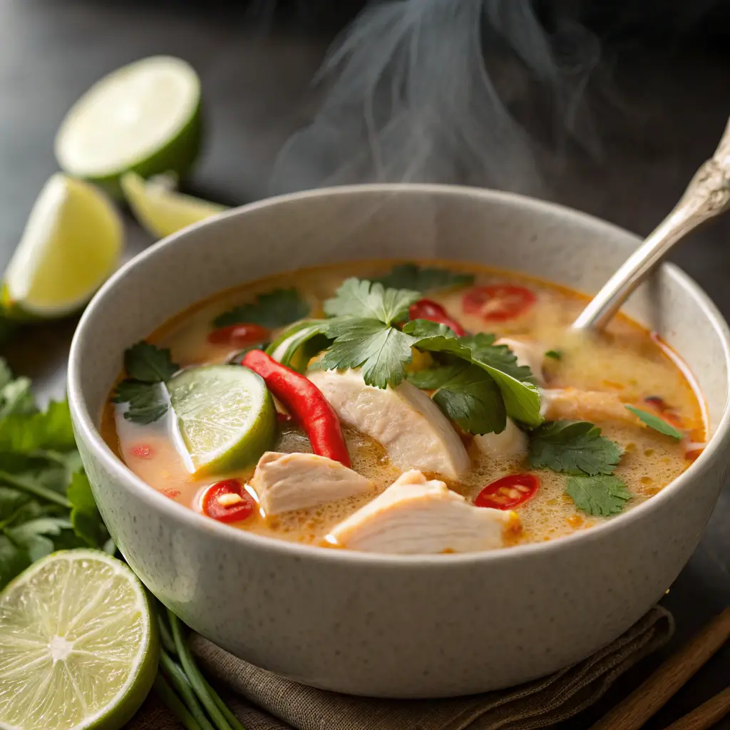 This soup is inspired by Tom Kha Gai, a classic Thai soup known for its harmonious blend of coconut, lime, and aromatic herbs. Originating from central Thailand, Tom Kha Gai was traditionally made with fresh ingredients such as galangal, kaffir lime leaves, and lemongrass. Over time, the recipe has evolved internationally, often incorporating accessible ingredients while retaining its signature hot-and-sour character.