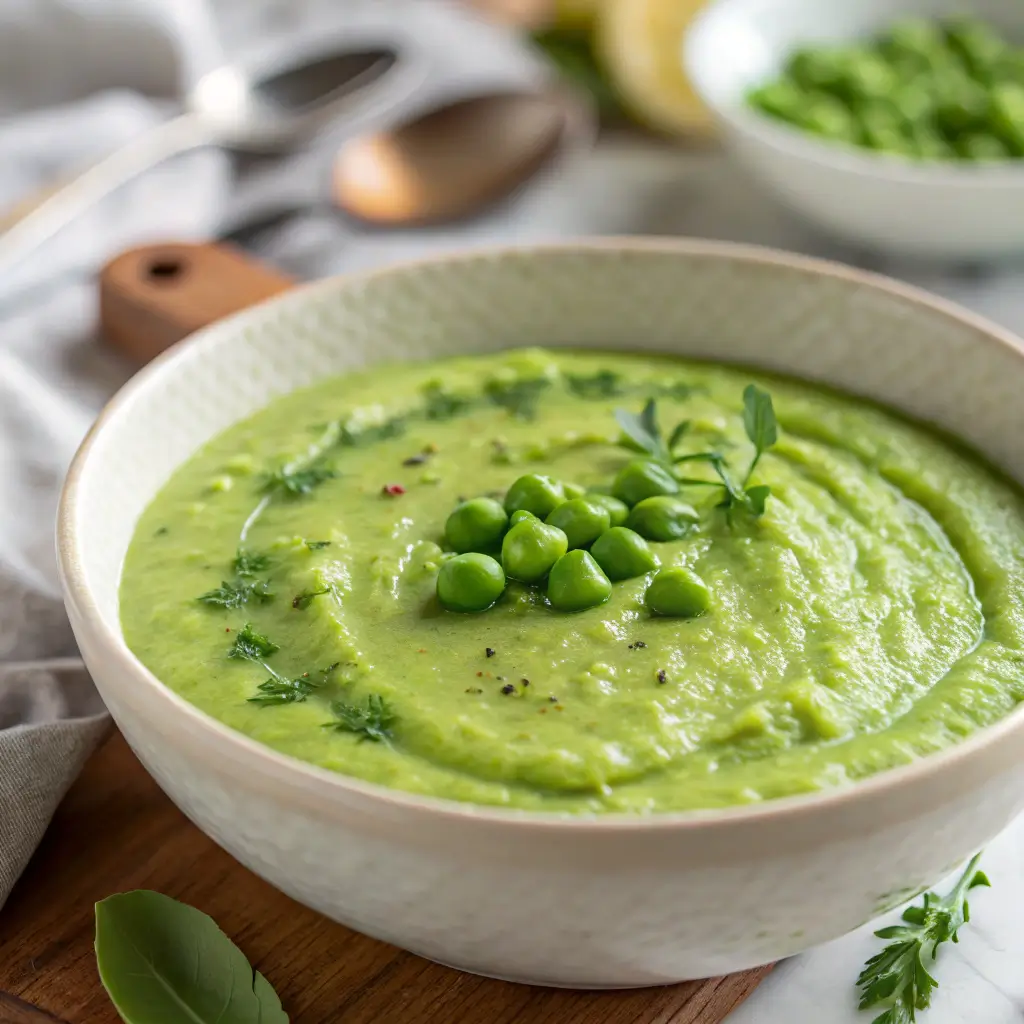 The success of this dish comes down to balance. The natural sweetness of peas is lifted by lemon’s acidity and complemented by aromatic herbs. A touch of cream or yogurt adds body, but the dish remains light and refreshing. Cooking the peas just until tender ensures they stay bright and flavorful, while blending creates a silky-smooth result.