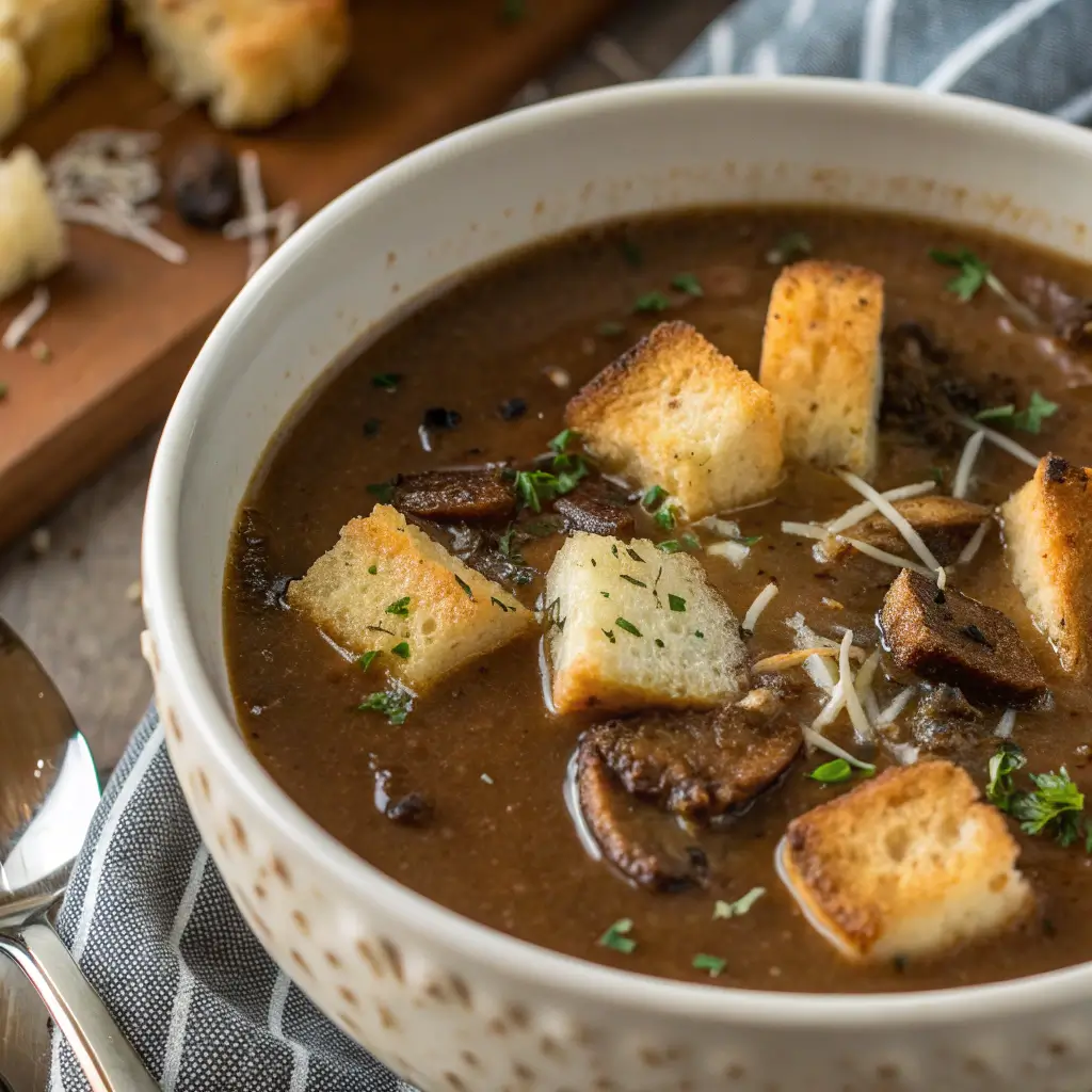 This Truffle Mushroom Soup with Gruyère Croutons is a creamy, earthy, and elegant soup that delivers restaurant-quality flavors at home. With its rich mushroom base, smooth texture, and crunchy cheesy topping, it’s perfect for cozy dinners, special occasions, or festive meals.