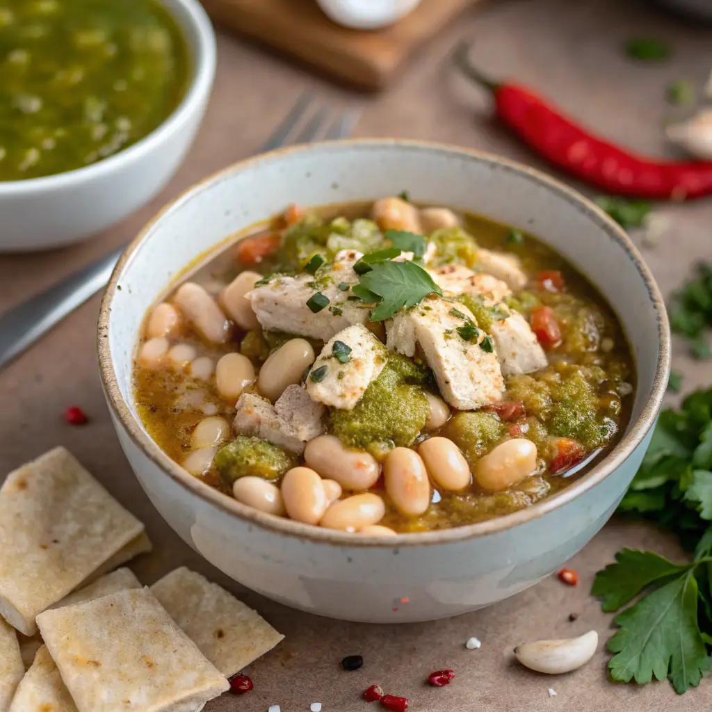 Serve this Turkey & White Bean Chili with Salsa Verde with warm corn tortillas, cornbread, or fluffy rice. For a fun presentation, ladle it into shallow bowls and top with contrasting colors — bright avocado, crisp tortilla strips, and creamy sour cream make it visually stunning.