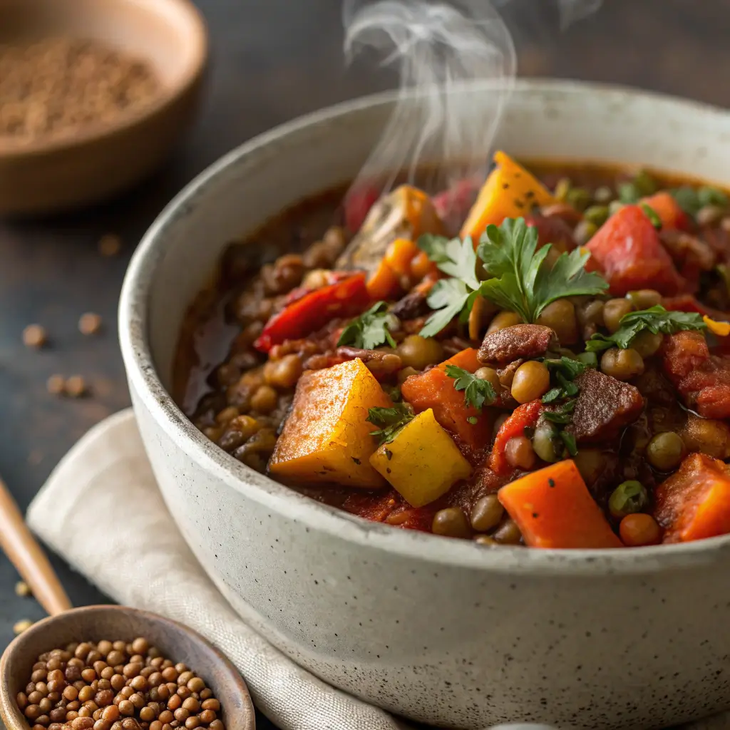 Packed with hearty lentils, roasted bell peppers, zucchini, and sweet potatoes, this plant-based dish delivers incredible flavor and nourishment in every spoonful. It’s rich, thick, and deeply satisfying — the kind of meal that warms you from the inside out while keeping things healthy and wholesome.