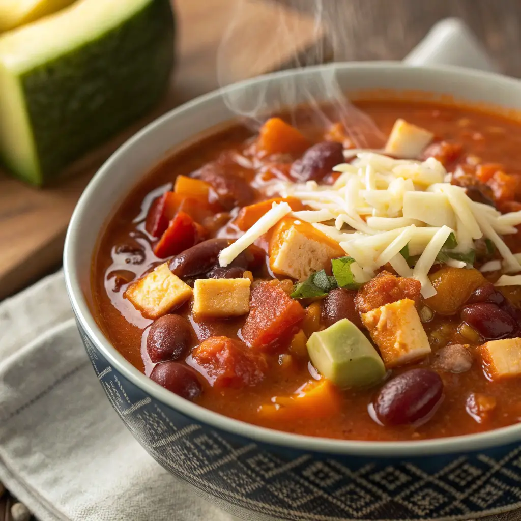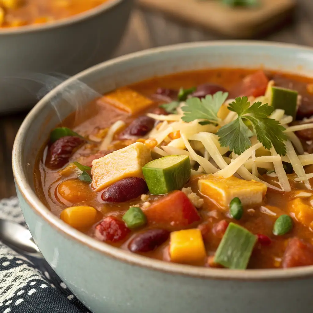 This soup is more than just a vegetarian alternative — it’s a full-bodied meal on its own. With a mix of tender beans, sweet corn, vibrant bell peppers, and a luscious tomato base, each spoonful delivers layers of flavor. Topped with melted cheese, fresh cilantro, and crunchy tortilla strips, it’s a celebration of textures and tastes that come together beautifully in one pot.
