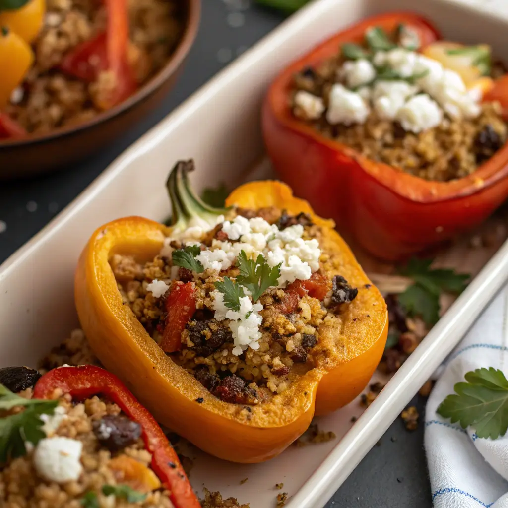 Spoon the quinoa and squash mixture generously into each roasted bell pepper. Pack gently so they’re well-filled but not overflowing. Arrange them upright in the baking dish. If desired, sprinkle a little nutritional yeast or vegan cheese on top.